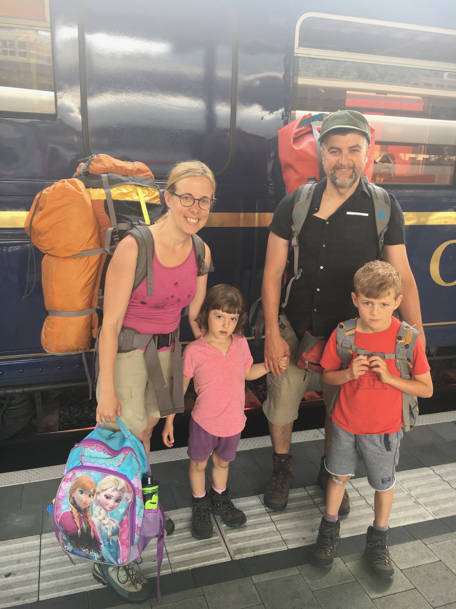 Je pense qu’il vaut la peine de s’attarder sur le voyage en train nous menant de la maison jusqu’à Saint-Moritz. Nous partons tôt le matin, chacun avec notre « frigidaire » sur le dos. Pas grave, nos années de canot camping nous ont habitués à ces portages.