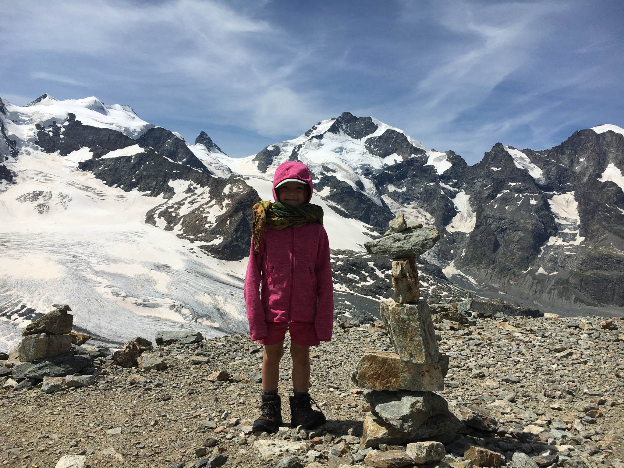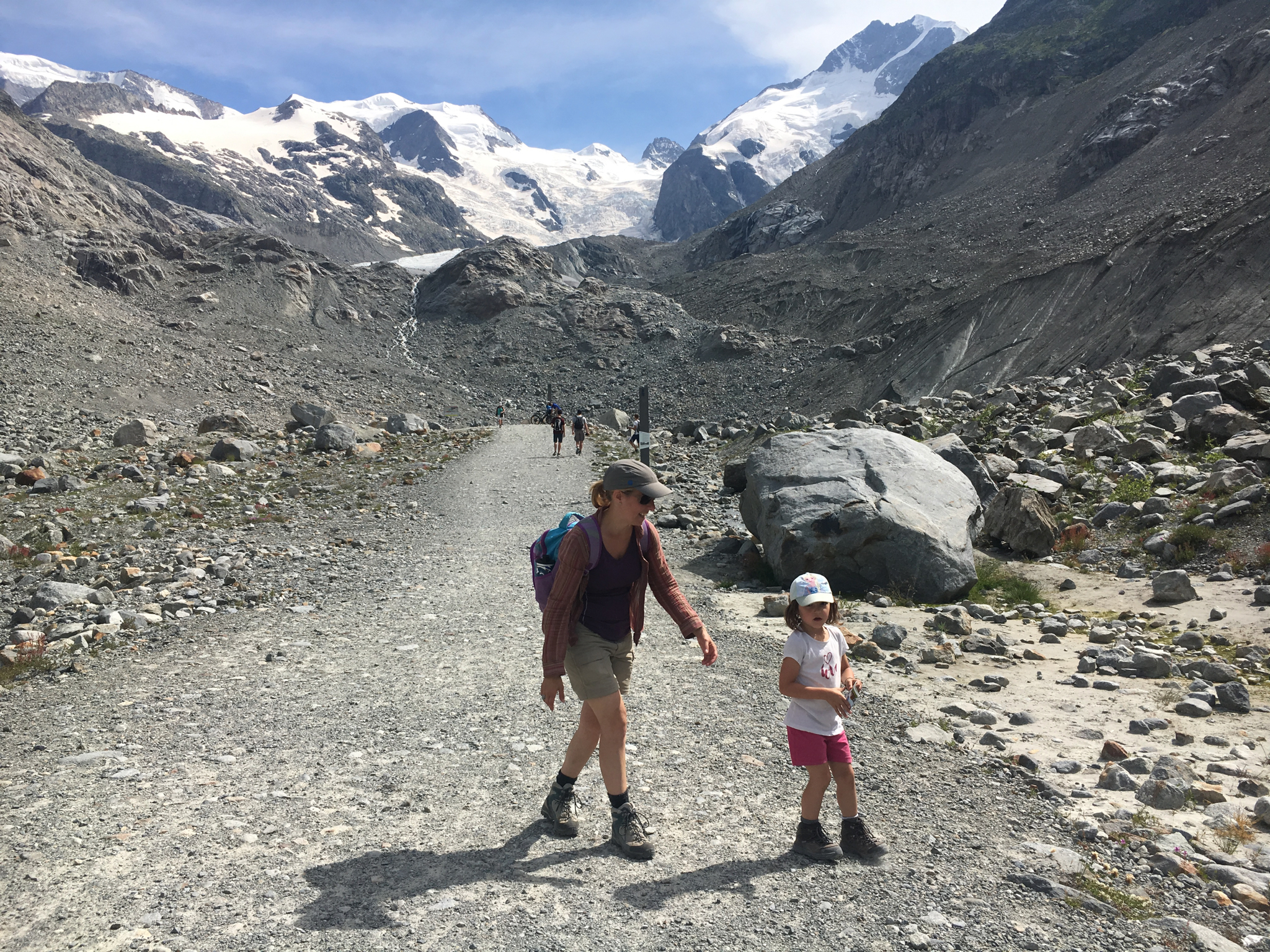 En après-midi, nous prenons le train pour aller visiter le Vadret da Morteratsch (pour pratiquer votre romanche). C’est le plus gros glacier de la vallée, mais dans les 160 dernières années, il a reculé de deux kilomètres à cause d’un réchauffement du climat dans la vallée. Un sentier balisé permet de marcher là où le glacier se trouvait jadis. Des panneaux d’information nous font prendre conscience de son ampleur en reculant dans le temps jusqu’en 1860. On remet aux enfants un petit guide où on appose un tampon à chaque étape. Chaque tampon fournit la lettre d’un code secret et les enfants gagnent un cadeau à leur retour à la gare s’ils connaissent le code (un yoyo, de la tisane, etc.). Ça les garde motivés! Ils en avaient bien besoin durant cette randonnée de deux heures au soleil.