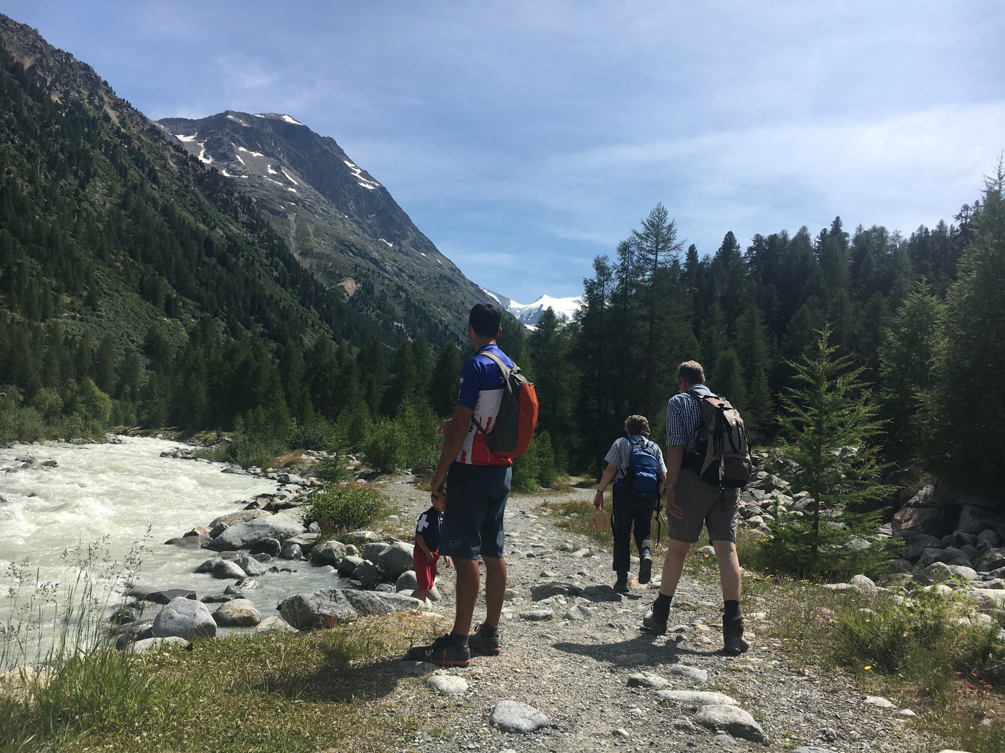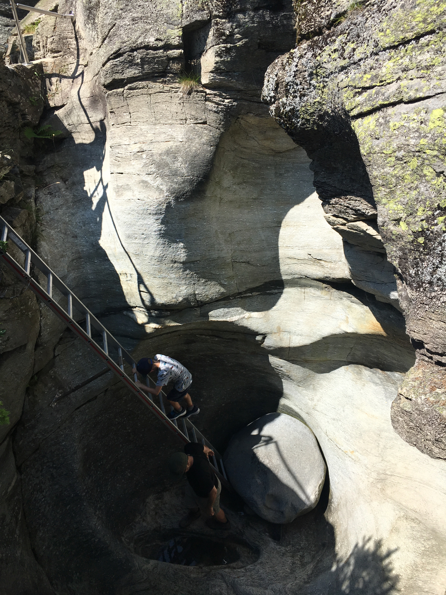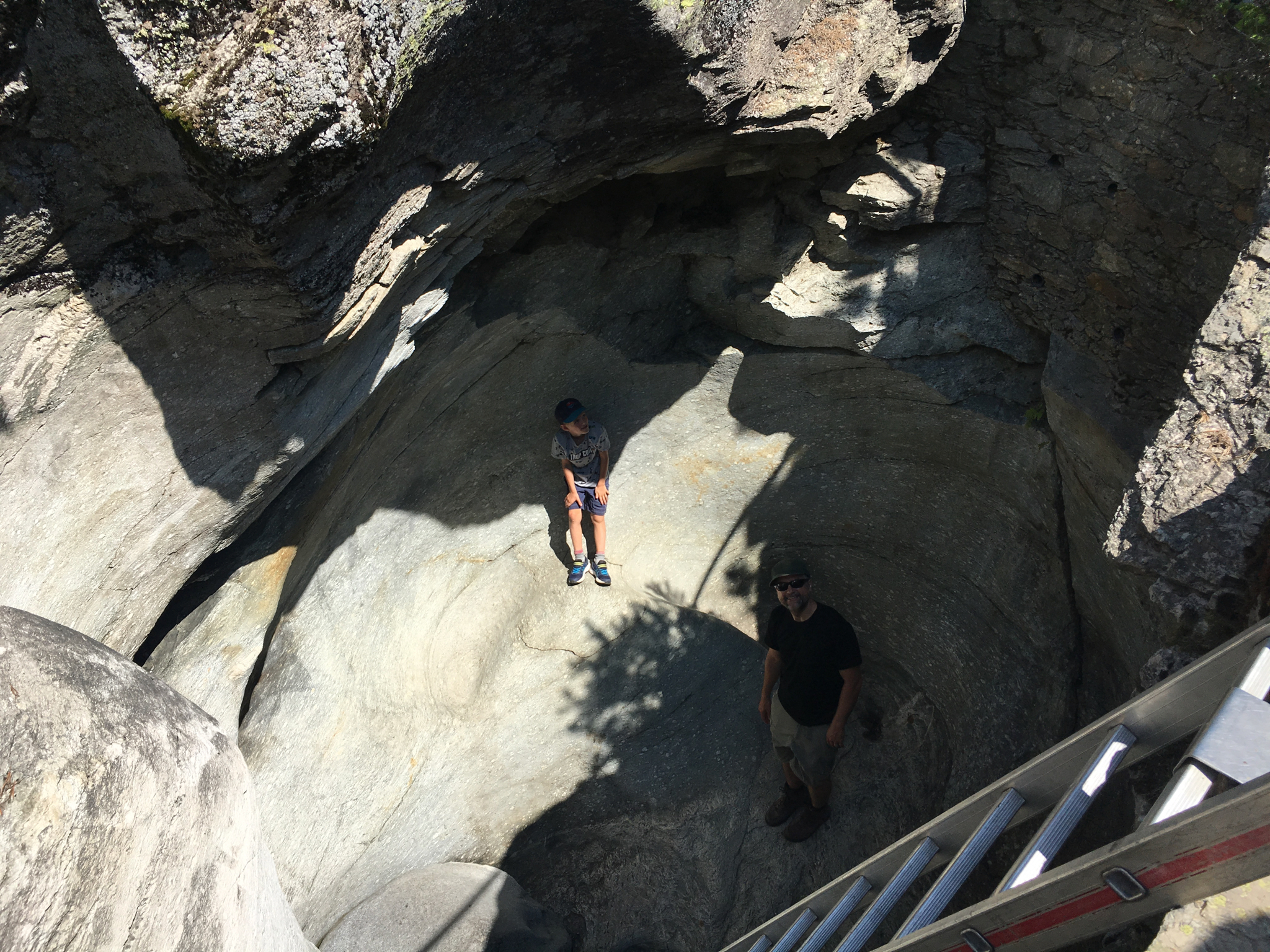 Nous avons démarré notre première journée en allant acheter le pain au boulanger ambulant qui visite le camping de 7h à 9h. Petit déjeuner englouti, nous démarrons notre exploration de cette vallée en allant visiter les marmites glaciaires de Cavaglia. Des puits circulaires creusés dans la roche mère par les vortex créés dans la couche aqueuse sous les glaciers en déplacement. Certains ont plus de 10 mètres de profondeur. La visite prend quelques heures et est super pour les enfants. Ceux-ci collectionnent des timbres et reçoivent un cadeau (comme au Vadret da Morteratsch, près de St-Moritz). En redescendant, nous avons vu plusieurs cyclistes de montagne descendre le sentier près de nous. En fait, ces cyclistes profitent du train pour monter près de 1000 m dans les montagnes puis passent la journée à redescendre. Astucieux! Ça avait l’air drôlement plaisant en tout cas.