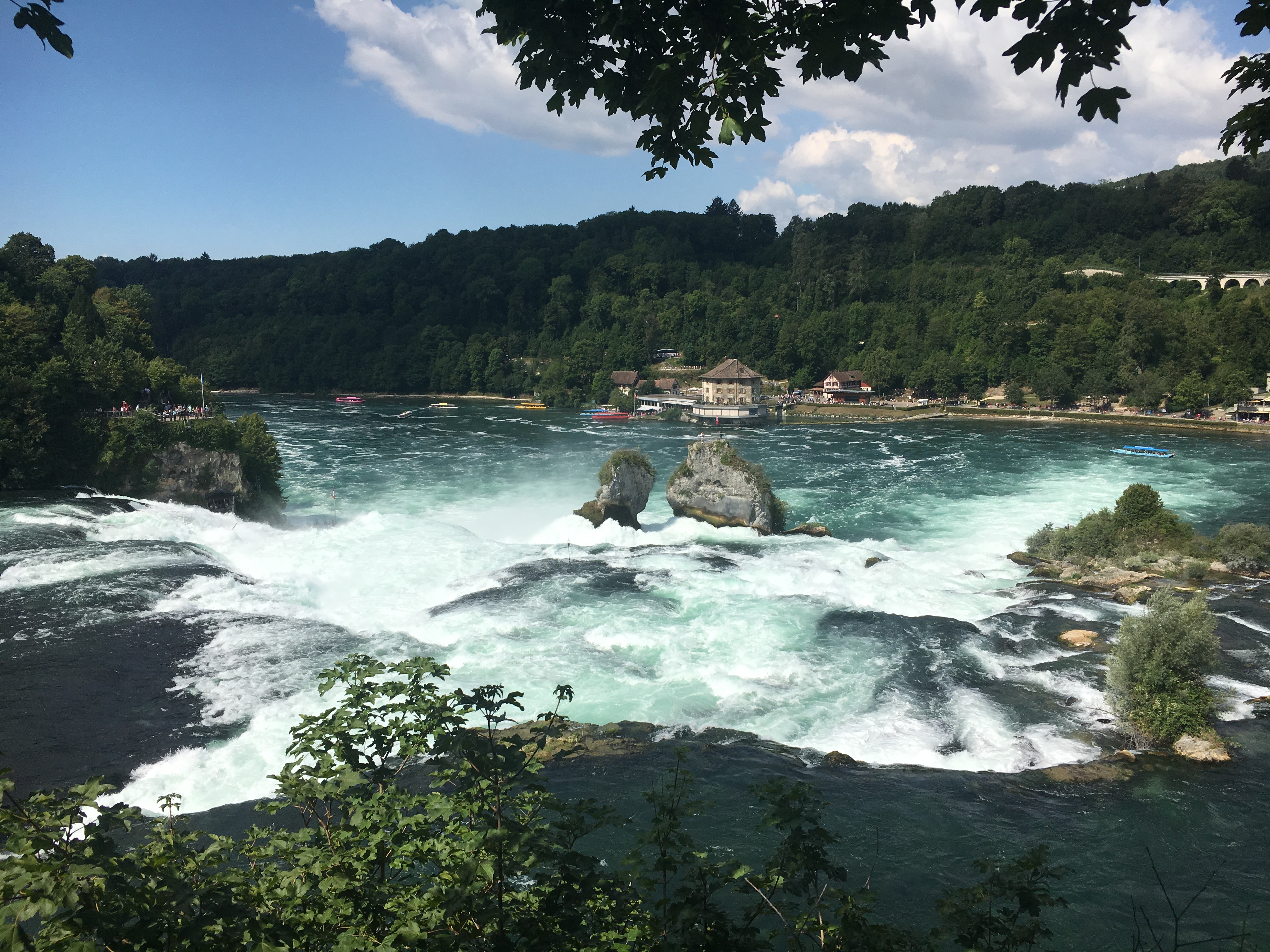 Les Chutes du Rhin vues du petit pont en amont. (Pour les canoteurs, la « chicken pass » est à droite…)