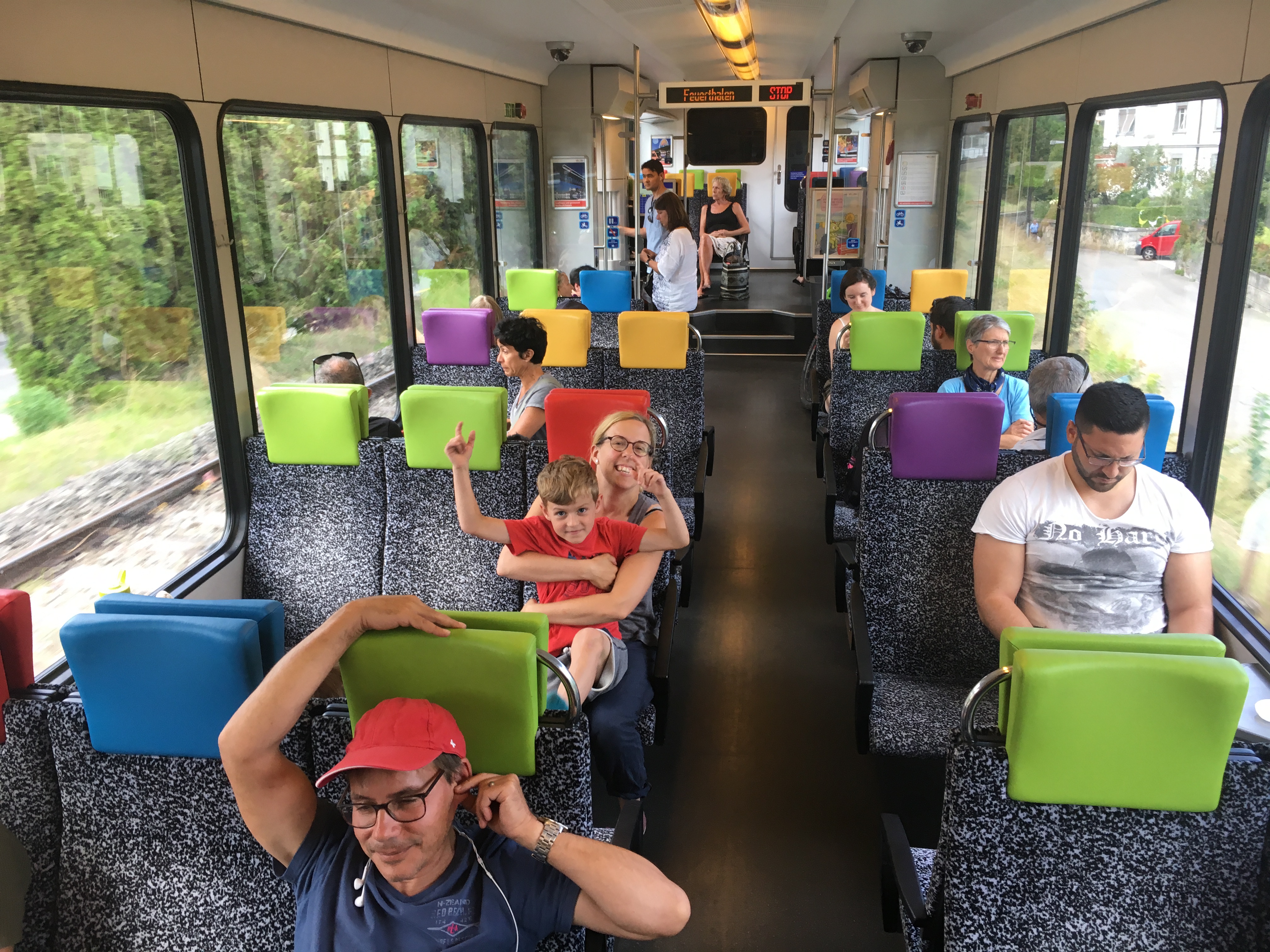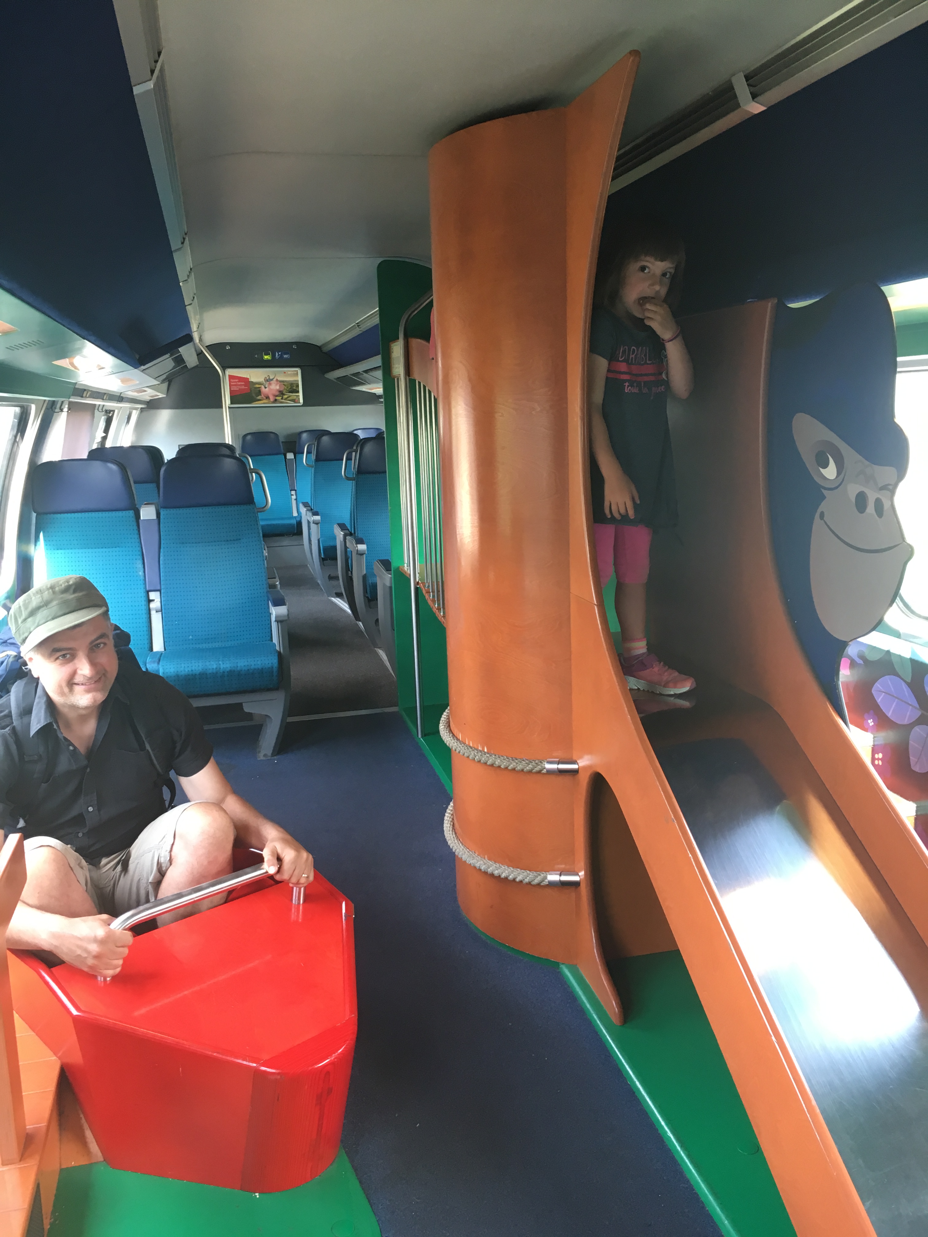Après s’être bien rincé l’oeil dans les chutes du Rhin, nous décidons de faire une heure de train supplémentaire pour aller visiter la ville de Constance, en Allemagne. Cette ville, au bord de l’immense lac du même nom est, depuis des siècles, une station balnéaire de prestige pour les Allemands, les Autrichiens et les Suisses qui se partagent ses rives bucoliques. Le train qui nous y emmène à de quoi réjouir la famille: on y trouve… un wagon pour enfants avec des modules de jeux intégrés!!! Les trains suisses ne finissent plus de nous étonner.
